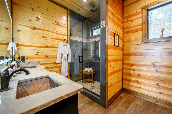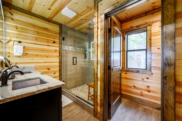 Wake up to serene pond views from your private King Suite—complete with soaking tub and walk-in shower