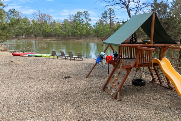 Fun for the little adventurers! The outdoor playground keeps kids smiling while parents relax on the deck nearby—family-friendly fun for all ages